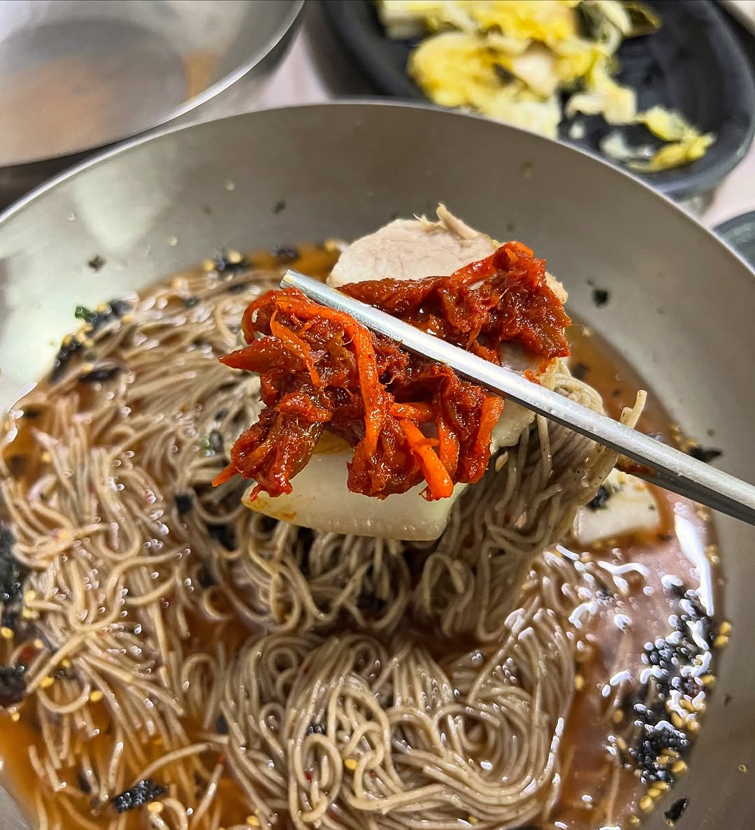 기본으로 나오는 메밀면은 따로 그릇에 덜어 향긋한 들기름에 비벼 먹어도 맛있고, 아삭한 백김치나 매콤한 명태회무침과 함께 싸 먹어도 꿀맛이더라고요.